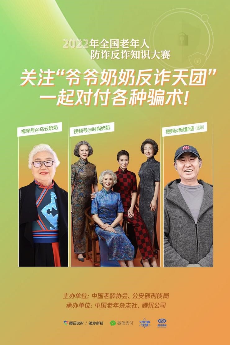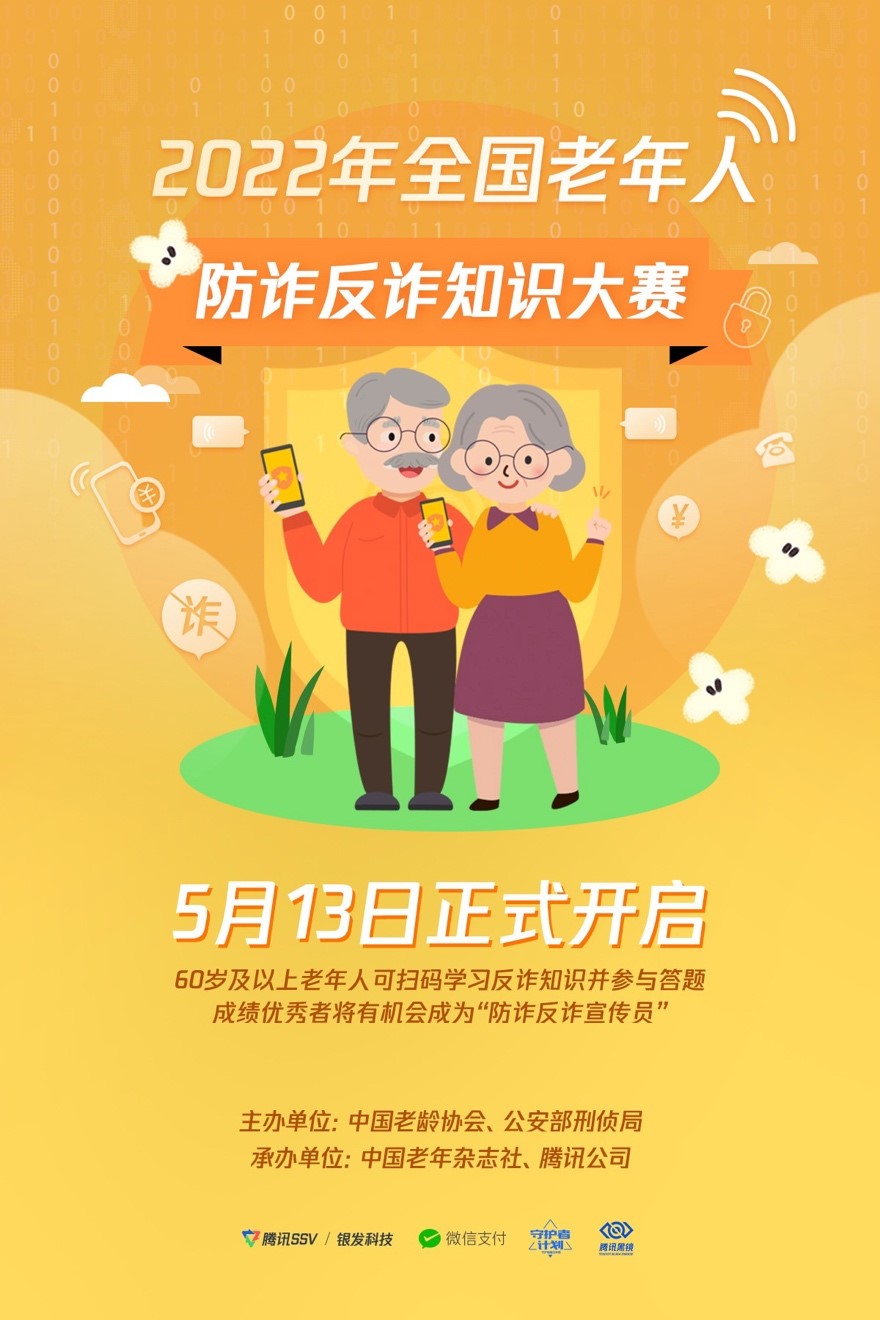 為提升老年群體防騙識騙能力,守護(hù)老年人的“錢袋子”, 5月13日,由中國老齡協(xié)會、公安部刑偵局主辦,中國老年雜志社、騰訊公司承辦的 “2022年全國老年人防詐反詐知識大賽”正式啟動。作為“全民反詐在行動”集中宣傳月的一項重要活動,大賽通過線上線下反詐知識科普、反詐知識競答等多種方式為老年人普及反詐知識。