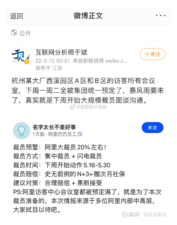 隨后,認(rèn)證為阿里巴巴員工的一名脈脈用戶發(fā)布“裁員預(yù)警”,其稱阿里將大裁員20%左右,裁員賠償是史無前例的N+3并贈次月社保。該員工也透露,“阿里訪客中心的會議室都被預(yù)定滿了,就是為了本次裁員準(zhǔn)備的,本次情報(bào)來源于多位阿里內(nèi)部中高層?!?/p>