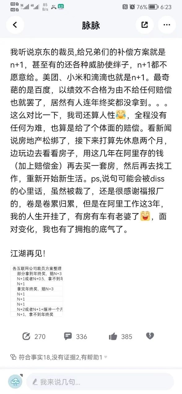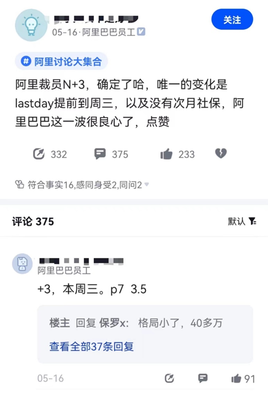 有阿里員工發(fā)文稱,“今天被約談了,這周五走N+3,緩沖29天是N+1,去年的校招生,目前手里沒offer,正在面試”。該員工還糾結(jié)是再待一個月還是拿n+3走人。還有員工發(fā)文證實(shí)阿里裁員N+3,并稱和之前流傳消息不同的是,最后期限提前到周三以及沒有次月社保。