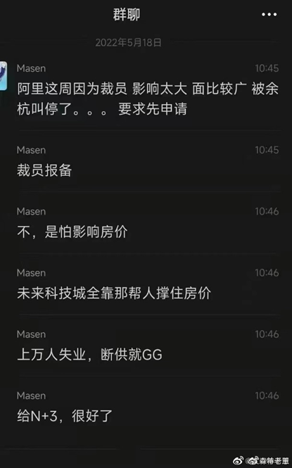 這般異常也引發(fā)了外界諸多猜測。5月18日,一則微信聊天記錄截圖在微博流傳,據(jù)截圖顯示,有網(wǎng)友稱“阿里這周因?yàn)椴脝T,影響太大,面比較廣,被余杭叫停了,要求先申請,裁員報(bào)備。”5月19日,另一網(wǎng)友出來“辟謠”,其稱“阿里裁員被余杭叫停是假消息,杭州炒房團(tuán)放的。”
