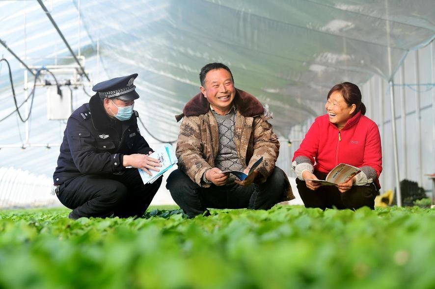 1月29日,安徽省阜南縣公安局會(huì)龍鎮(zhèn)派出所民警在轄區(qū)豐振生態(tài)農(nóng)業(yè)科技園溫室大棚里,向種植戶宣講防范網(wǎng)絡(luò)電信詐騙知識(shí)。