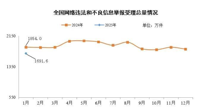 2025年1月全國受理網絡違法和不良信息舉報1691.6萬件