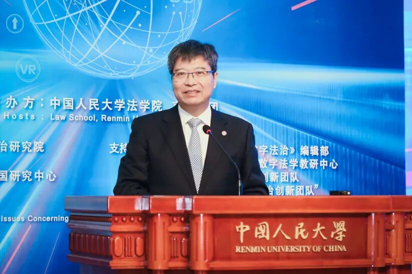 圖為中國人民大學(xué)校長林尚立在平行主題論壇——第六屆“未來法治與數(shù)字法學(xué)”國際論壇中致辭。
