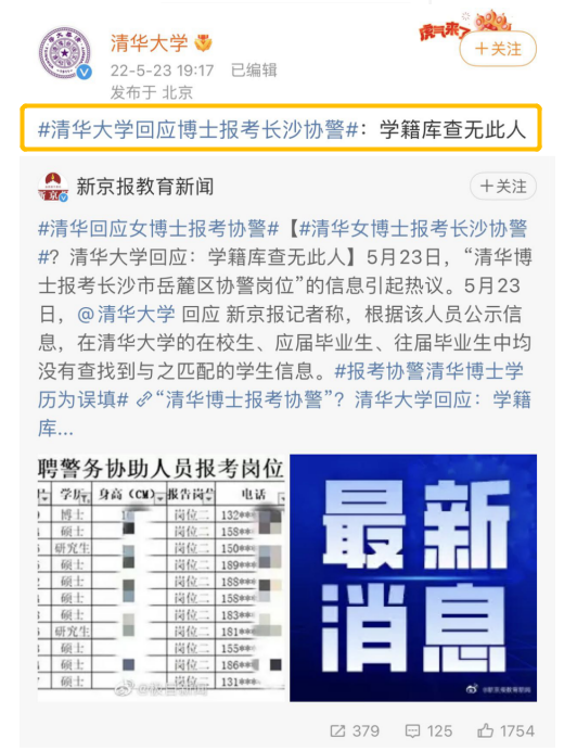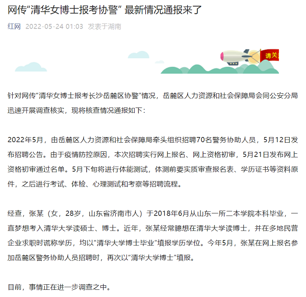 5月23日,有關(guān)“清華博士報考長沙市岳麓區(qū)協(xié)警崗位”的網(wǎng)上消息引發(fā)關(guān)注,并沖上微博熱搜。有媒體報道稱,近日網(wǎng)友爆料,有清華博士生報考長沙市岳麓區(qū)協(xié)警崗位。據(jù)岳麓區(qū)人民政府官網(wǎng)5月21日公布的《岳麓區(qū)2022年招聘警務(wù)協(xié)助人員報考審核通過名單公告》顯示,在通過“警務(wù)協(xié)助人員崗位二”審核的人員表格中,出現(xiàn)了眾多高學歷人員,其中最高學歷為一位1994年出生的張姓女博士(特長備注為“清華大學”)。