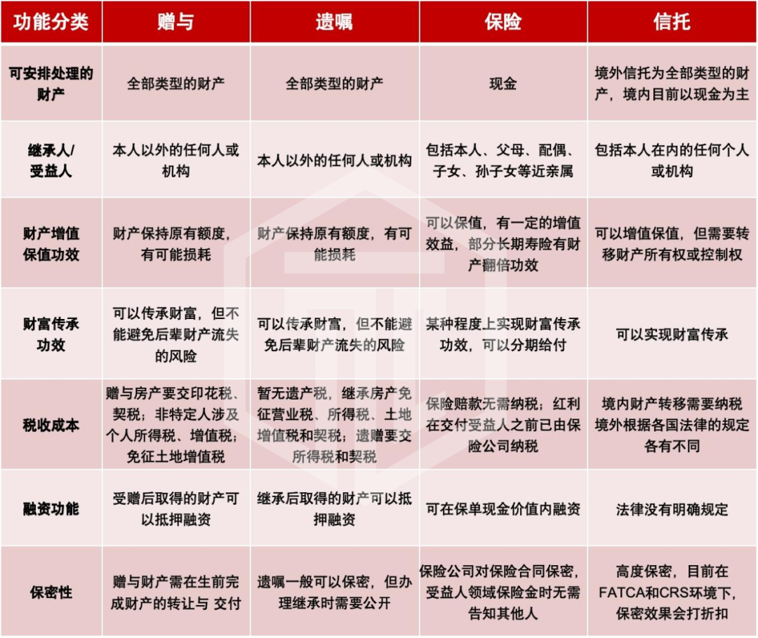 以上即為幾種常用財富傳承工具的對比與分析,我們可以結(jié)合自身情況進(jìn)行傳承規(guī)劃的安排。