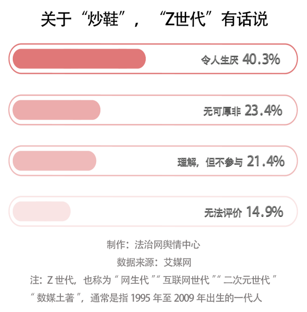 從艾媒網(wǎng)發(fā)布的數(shù)據(jù)來(lái)看,40.3%的“Z世代”(通常是指1995年至2009年伴隨著互聯(lián)網(wǎng)出生的一代人)厭惡“炒鞋”這一行為,23.4%的“Z世代”則認(rèn)為“炒鞋”無(wú)可厚非。