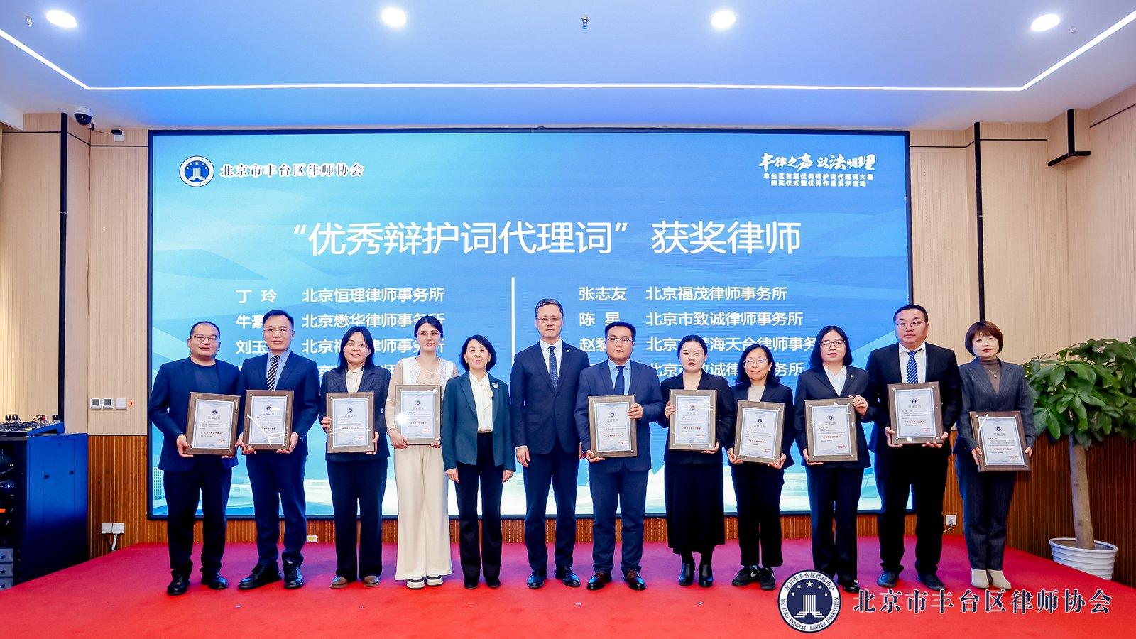 12月3日,由北京市豐臺(tái)區(qū)司法局指導(dǎo),豐臺(tái)區(qū)律師協(xié)會(huì)主辦的首屆優(yōu)秀辯護(hù)詞代理詞大賽頒獎(jiǎng)儀式暨優(yōu)秀作品展示活動(dòng)圓滿收官。北京市律師協(xié)會(huì)副會(huì)長郝春莉,豐臺(tái)區(qū)委政法委副書記王文征,豐臺(tái)區(qū)司法局黨組成員、副局長佟穎,北京市律師協(xié)會(huì)副會(huì)長、豐臺(tái)區(qū)律師協(xié)會(huì)會(huì)長胡占全等領(lǐng)導(dǎo)及行業(yè)知名專家出席活動(dòng),豐臺(tái)區(qū)律師協(xié)會(huì)品牌建設(shè)委員會(huì)主任時(shí)福茂主持大會(huì)。