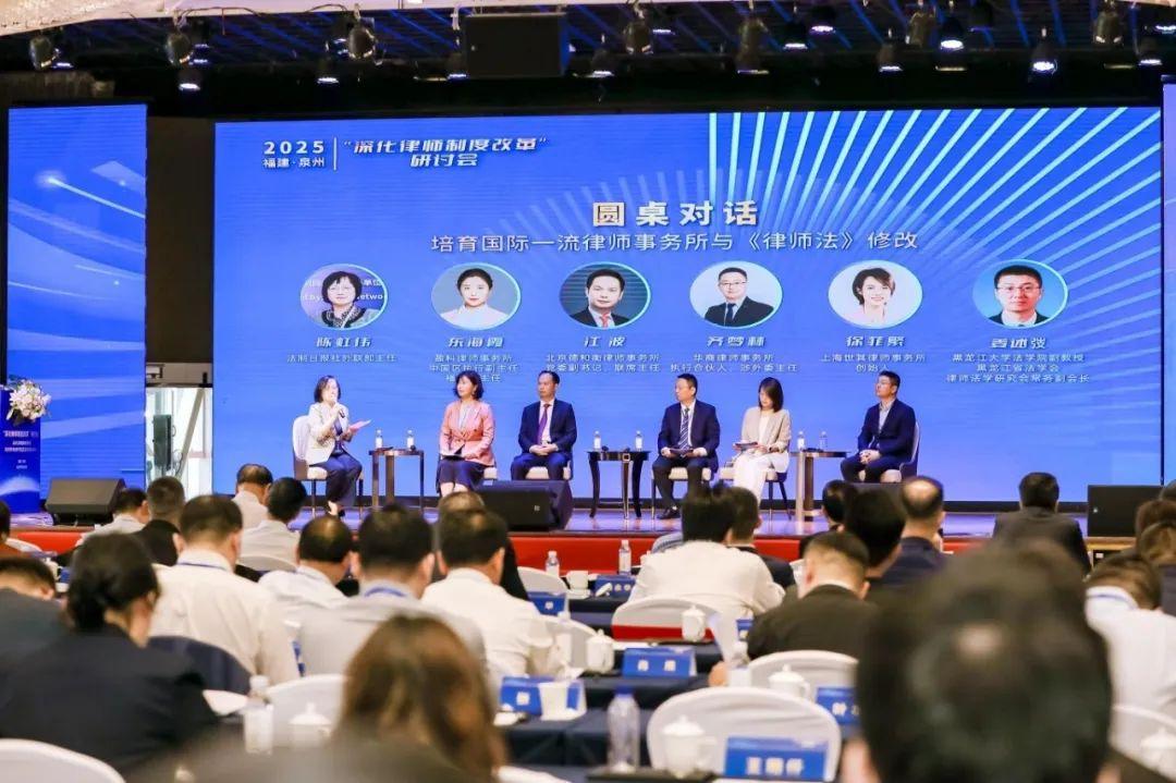 在圓桌對話環(huán)節(jié)中,盈科律師事務所中國區(qū)執(zhí)行副主任、盈科福建區(qū)主任東海霞、北京德和衡律師事務所黨委副書記、聯席主任江波、華商律師事務所執(zhí)行合伙人、涉外委主任齊夢林、上海世其律師事務所創(chuàng)始人 徐菲繁、黑龍江大學法學院副教授、黑龍江省法學會律師法學研究會常務副會長姜述弢圍繞“培育國際一流律師事務所與律師法修改”進行交流,法制日報社外聯部主任陳虹偉主持。