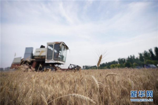 6月13日,雄安新區(qū)大王鎮(zhèn)小王村村民在收獲小麥。 近日,雄安新區(qū)小麥陸續(xù)成熟,當(dāng)?shù)卮迕駬屪マr(nóng)時進(jìn)行收獲。 新華社記者 朱旭東 攝