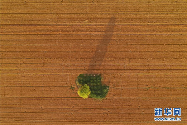 6月13日無人機拍攝的雄安新區(qū)大王鎮(zhèn)小王村成熟的麥田。 近日,雄安新區(qū)小麥陸續(xù)成熟,當?shù)卮迕駬屪マr時進行收獲。 新華社記者 朱旭東 攝