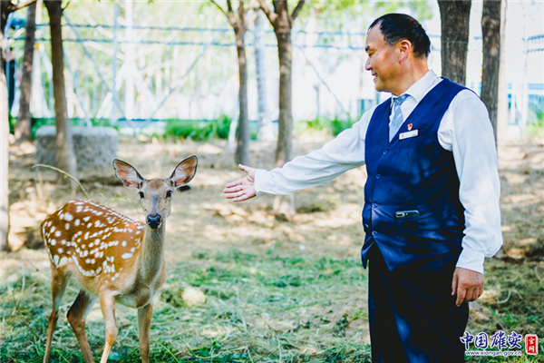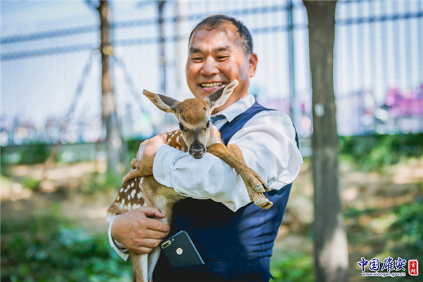 6月23日下午1點48分,雄安新區(qū)的梅花鹿“雄雄、安安”順利生下鹿寶寶。圖為雄安市民服務中心園區(qū)環(huán)境管理部主任李國元抱著鹿寶寶。中國雄安官網(wǎng)記者馬夢迪 攝
