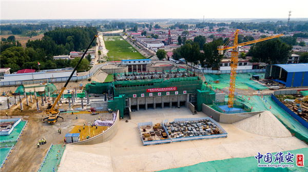 白洋淀引黃大樹劉泵站工程位于雄安新區(qū)雄縣七間房鄉(xiāng),由任文干渠段和泵站兩部分組成,其中任文干渠段主要包括攔冰索、任文干渠整治工程以及清污閘;泵站主要包括十二孔閘改造、進水池、出水池、泵房及附屬建筑物。泵站主體造型設(shè)計語言為“黃河之水天上來”,外觀造型上利用新型建筑材料營造出直瀑的樣式,猶如黃河之水從天上滔滔而下。圖為航拍白洋淀引黃大樹劉泵站工程現(xiàn)場。中國雄安官網(wǎng)記者馬夢迪 攝