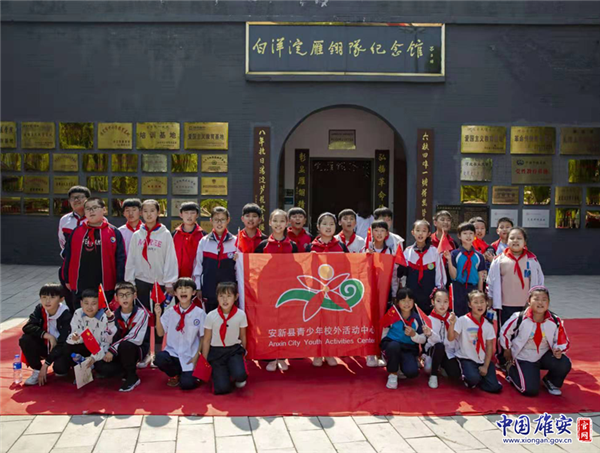 孩子們在白洋淀雁翎隊紀念館門口合影留念。中國雄安官網(wǎng)發(fā)