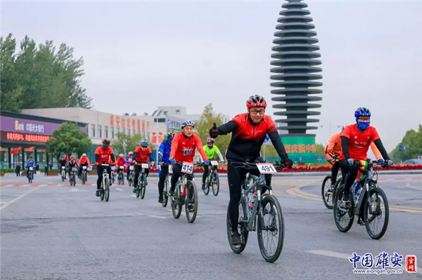 2019全民健身·雄安新區(qū)環(huán)白洋淀國際自行車賽現(xiàn)場,參賽選手面對鏡頭豎起大拇指。