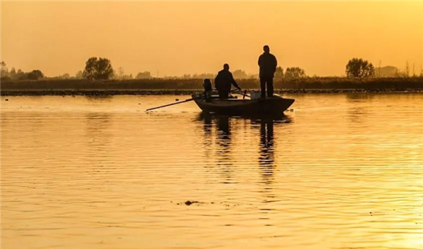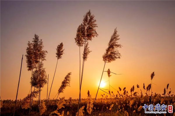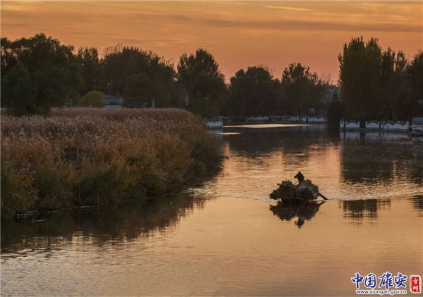 白洋淀碼頭附近,夕陽映著稻田,一派和諧靜謐的景象。中國雄安官網(wǎng)毛鶴然 攝
