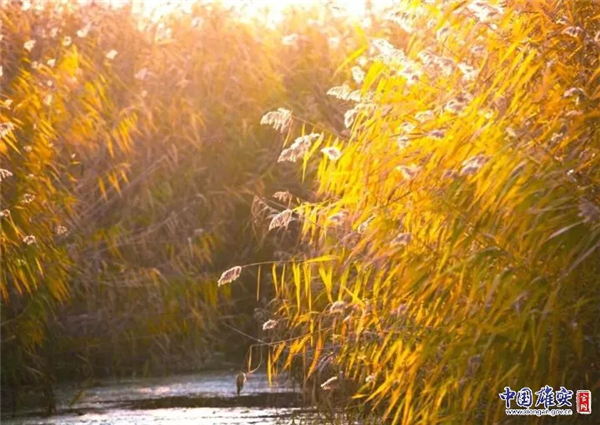 深秋時(shí)節(jié)的白洋淀旁,大片水稻成熟,滿目金黃。中國雄安官網(wǎng)毛鶴然 攝