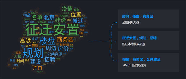 《報(bào)告》顯示,房?jī)r(jià)、規(guī)劃、建設(shè)、招聘和高鐵是過(guò)去兩年全國(guó)民眾對(duì)雄安的持續(xù)關(guān)注熱點(diǎn)。與2019年相比,“商務(wù)區(qū)”首次進(jìn)入全國(guó)熱門搜索詞,這反映出越來(lái)越多的人開(kāi)始考慮到雄安新區(qū)開(kāi)展相關(guān)商業(yè)活動(dòng)的可能。雄安新區(qū)本地民眾的關(guān)注重點(diǎn),則保持了相對(duì)穩(wěn)定,“搬遷”和“規(guī)劃”等主題詞近兩年持續(xù)受到關(guān)注。此外,“疫情”和“公共資源”等新的熱點(diǎn)詞開(kāi)始受到雄安新區(qū)本地民眾的關(guān)注,體現(xiàn)了雄安新區(qū)當(dāng)前建設(shè)階段新的特點(diǎn)。