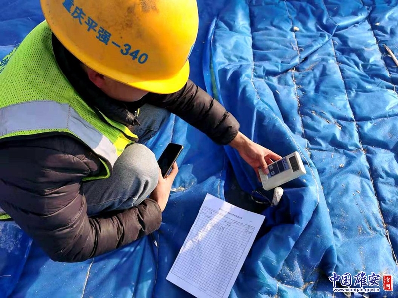 雄安商務服務中心項目二標段建設現(xiàn)場,建設工人對施工作業(yè)面進行測溫。中建八局供圖