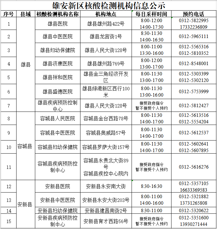 雄安新區(qū)核酸檢測(cè)機(jī)構(gòu)信息公示