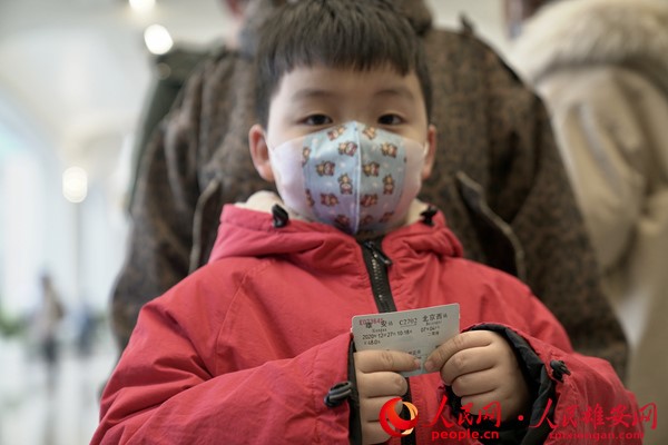 2020年12月27日上午,京雄城際鐵路全線開通運(yùn)營(yíng),一位小朋友手里拿著雄安到北京西的車票。人民網(wǎng) 宋燁文攝