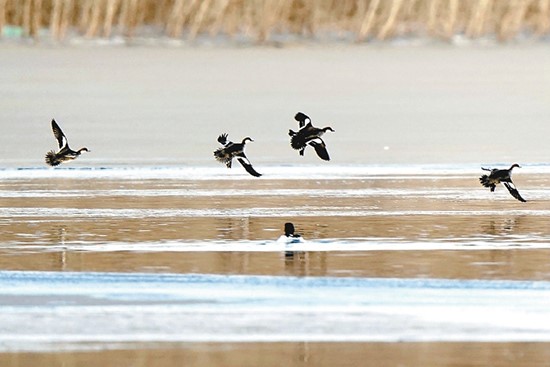 在園博園園博湖附近,鳥兒迎著日出展翅飛翔。隨著永定河生態(tài)環(huán)境越來越好,已有十幾種野生鳥類活躍在周邊。 北京日?qǐng)?bào)記者 劉平攝