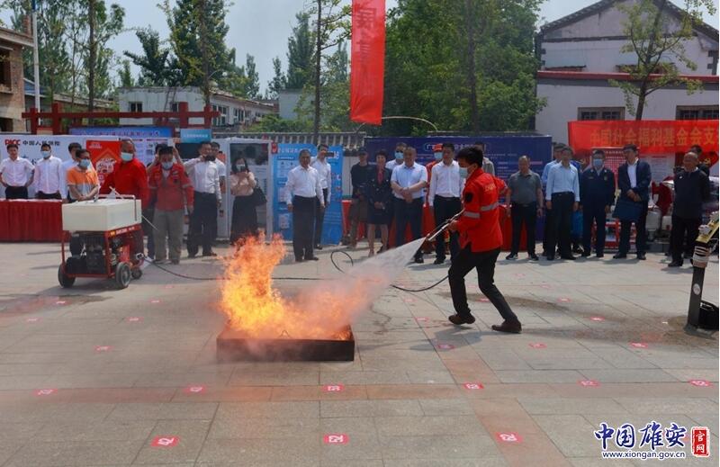 在全國(guó)防災(zāi)減災(zāi)日宣傳活動(dòng)現(xiàn)場(chǎng),戴泊生向安新小學(xué)頒發(fā)省級(jí)地震科普教育示范學(xué)校牌匾,劉樹軍向東淀頭村頒發(fā)全國(guó)綜合減災(zāi)示范社區(qū)牌匾,兩位領(lǐng)導(dǎo)共同向雄州救援隊(duì)、雄風(fēng)救援隊(duì)、藍(lán)天救援隊(duì)、美團(tuán)代表隊(duì)等新區(qū)安全宣傳志愿者隊(duì)伍代表授旗。中國(guó)人民財(cái)產(chǎn)保險(xiǎn)股份有限公司雄安分公司籌建負(fù)責(zé)人張友林為活動(dòng)致開幕詞,中國(guó)福利基金會(huì)支持雄安公益基金執(zhí)行主任、北京支持雄安產(chǎn)業(yè)發(fā)展促進(jìn)會(huì)常務(wù)副會(huì)長(zhǎng)兼秘書長(zhǎng)彌雪向雄安新區(qū)捐贈(zèng)了高空細(xì)水霧滅火消防車。