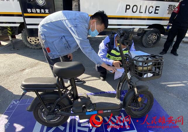 容東片區(qū)服務點的民警正在查驗群眾的電動自行車。人民網(wǎng) 劉師豪攝