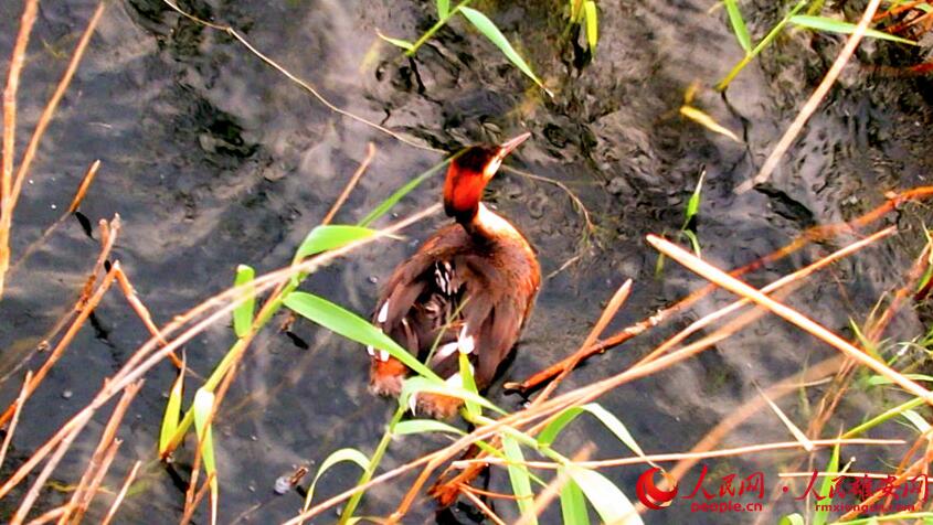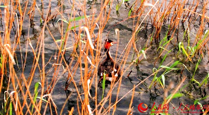 鳥(niǎo)兒背負(fù)雛鳥(niǎo)穿梭于蘆葦蕩中,畫(huà)面溫馨有愛(ài)。高騰攝