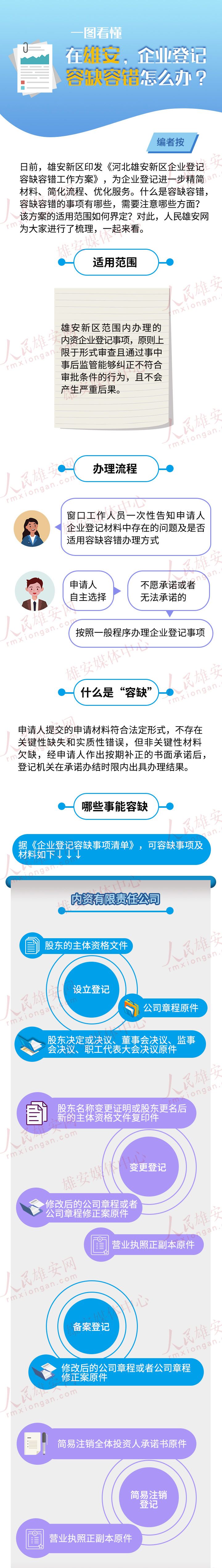 人民網(wǎng)雄安5月25日電 日前,雄安新區(qū)印發(fā)《河北雄安新區(qū)企業(yè)登記容缺容錯工作方案》,為企業(yè)登記進一步精簡材料、簡化流程、優(yōu)化服務。什么是容缺容錯,容缺容錯的事項有哪些,需要注意哪些方面?該方案的適用范圍如何界定?對此,人民雄安網(wǎng)為大家進行了梳理,一起來看。