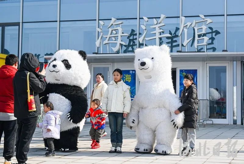 2月12日,游客們?cè)谛郯残聟^(qū)郊野公園海洋館前拍照留念。
