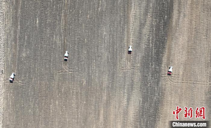 10月22日,河北雄安新區(qū)安新縣端村鎮(zhèn)關(guān)城二村一農(nóng)田內(nèi),幾臺(tái)“鴻鵠T70”電動(dòng)智能拖拉機(jī)正在進(jìn)行秋播作業(yè)。(無人機(jī)照片)中新社記者 韓冰 攝
