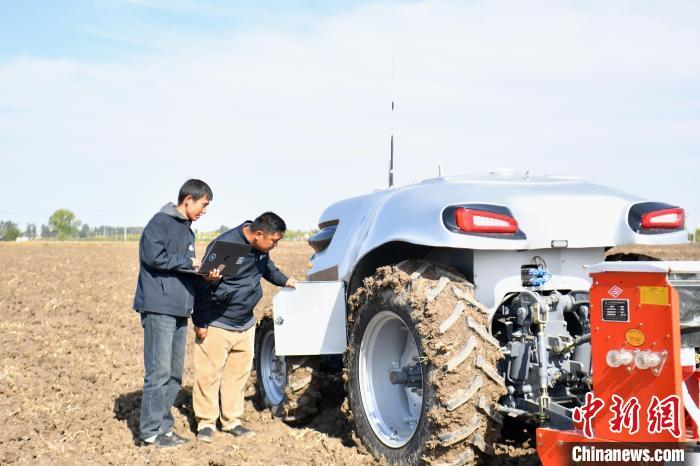 10月22日,河北雄安新區(qū)安新縣端村鎮(zhèn)關(guān)城二村一農(nóng)田內(nèi),工作人員對(duì)“鴻鵠T70”電動(dòng)智能拖拉機(jī)進(jìn)行秋播作業(yè)前檢測(cè)。中新社記者 韓冰 攝