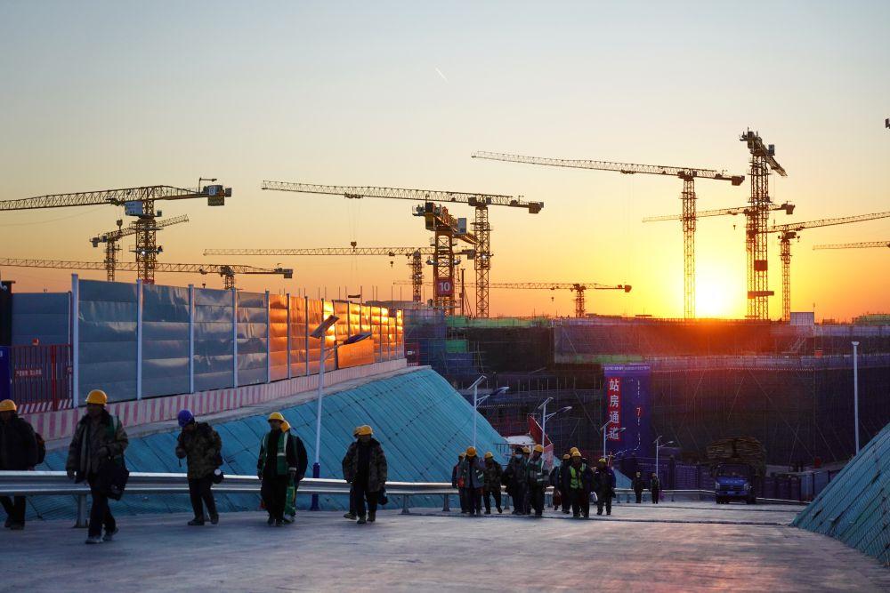 落日余暉下的雄安新區(qū)國貿(mào)片區(qū)建設(shè)現(xiàn)場(2025年1月15日攝)。新華社記者 牟宇 攝