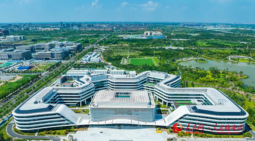 中國星網以四瓣之花為形,中心玉琮狀建筑承衛(wèi)星之韻,周邊飄帶環(huán)繞,繪就城市綠軸新畫卷,映照“花綻雄安,星耀華夏”。人民網記者 李兆民攝