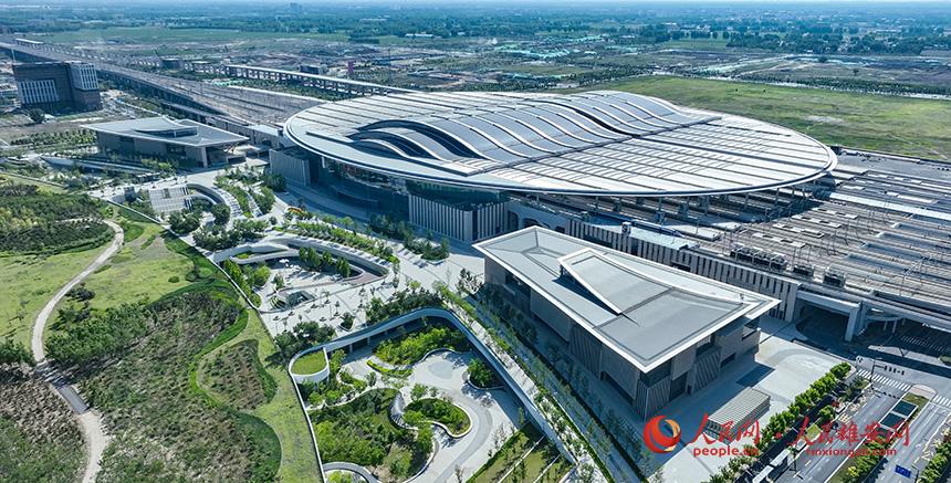 雄安高鐵站,從空中俯瞰,形似“青蓮滴露”,鑲嵌在雄安新區(qū)昝崗片區(qū)。人民網記者 李兆民攝