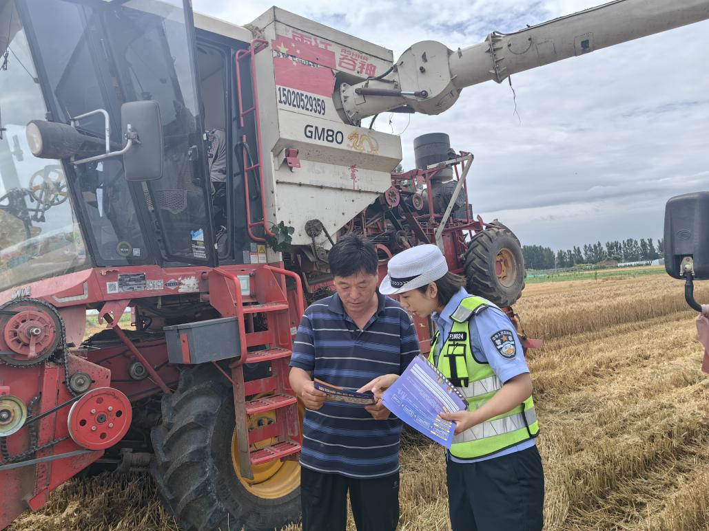 6月16日上午,雄縣王家房村邊的田地上,雄縣交警大隊(duì)張雪嬌面前圍攏著幾位剛停下收割機(jī)的駕駛員。汗水順著她的臉頰不停地流淌,警服后背早已被汗水浸透,但她依然耐心地向駕駛員們講解著交通安全知識(shí)。