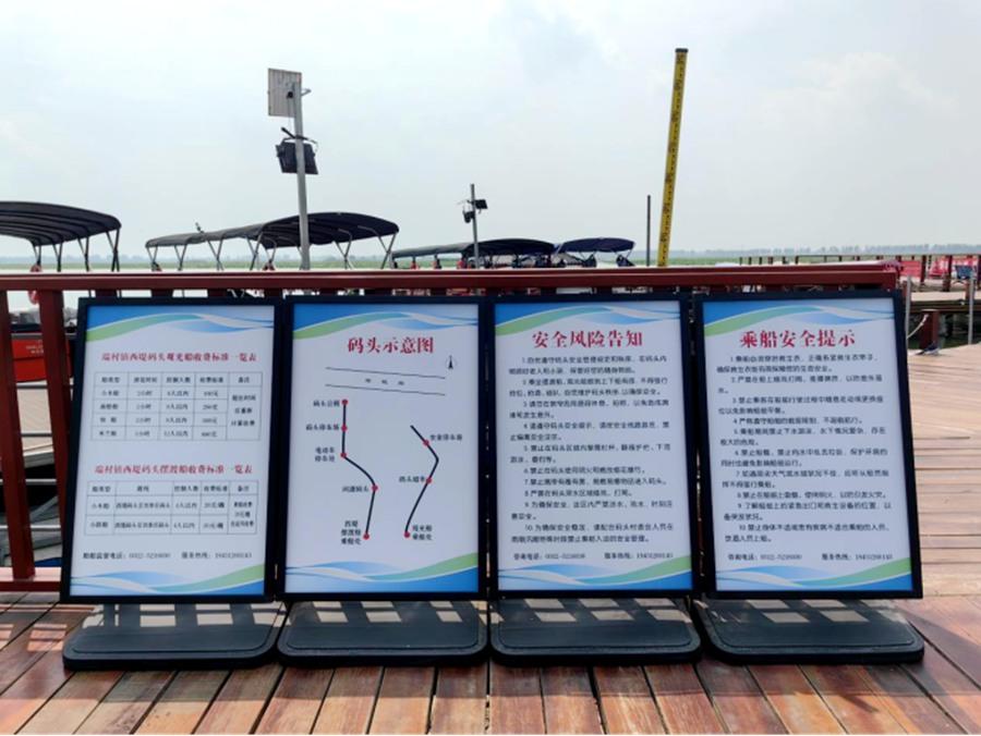 統(tǒng)一服務(wù)、標(biāo)準(zhǔn)化流程。每艘船出發(fā)前,船工都會(huì)用擴(kuò)音器播放安全提示。乘船安全提示、安全風(fēng)險(xiǎn)告知等展牌整齊地?cái)[放在出入口。志愿者會(huì)在碼頭為游客提供服務(wù)。