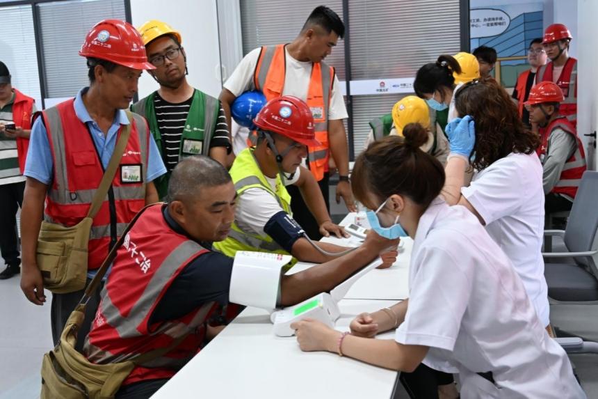 醫(yī)生志愿者為工友測量血壓。啟動區(qū)管委會供圖