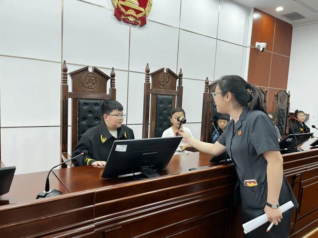 審判庭是此次參觀的“重頭戲”。推開審判庭厚重的大門,審判席、原告席、被告席整齊排列,莊嚴的氛圍讓孩子們瞬間安靜下來,在工作人員的邀請下,孩子們輪流坐上審判席,感受法袍的重量與審判席的莊嚴,他們輕輕敲擊法槌,體驗“小法官”的感覺?!扒梅ㄩ硶r要嚴肅,因為這代表著公正裁判”工作人員為其科普法槌的意義,孩子們似懂非懂地點頭,小臉上寫滿了認真。