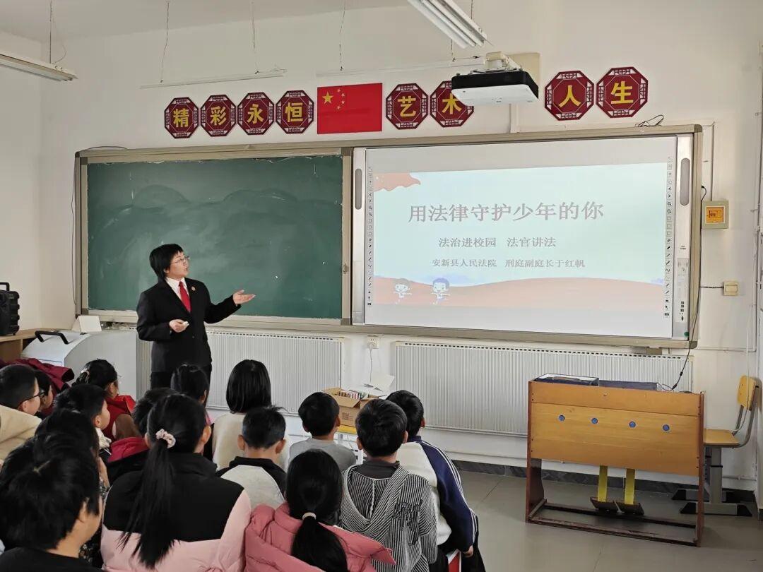 走進安新南六小學、大趙莊小學,法官們結(jié)合青春期學生的心理特點與成長需求,以通俗的語言、真實的案例,生動講解防范校園欺凌、性侵害、網(wǎng)絡(luò)沉迷及電信詐騙等關(guān)鍵知識。在五星紅旗下,同學們高舉右拳,莊嚴宣誓:“不做殘忍的欺凌者、不做冷漠的旁觀者、不做沉默的受害者,團結(jié)同學、友善待人!”鏗鏘誓言回蕩校園,不僅將法治信念深深鑄入童心,也將整場活動推向情感的高潮。