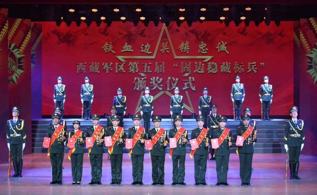 1月23日晚,在西藏軍區(qū)第五屆“固邊穩(wěn)藏標(biāo)兵”頒獎(jiǎng)儀式,王應(yīng)學(xué)(前排左三)等10名標(biāo)兵上臺(tái)領(lǐng)取榮譽(yù)證書、獎(jiǎng)杯