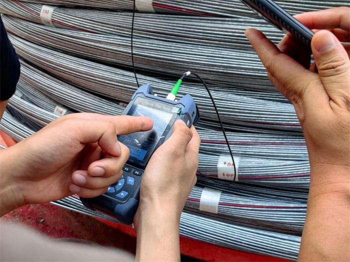 由于智慧纜索光纖成分是二氧化硅,安裝過程精度要求高,施工過程中,六安8標現(xiàn)場管理人員和工人聚精會神、精準調(diào)度,嚴格控制牽引速度,排查各工序?qū)鈻殴饫w的保護措施。6日16時許,智慧纜索成功拉通入鞍后順利通過功能檢測。
