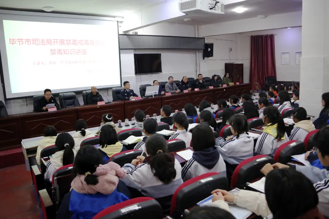 近日,貴州省畢節(jié)強(qiáng)制隔離戒毒所(以下稱畢節(jié)所)攜手畢節(jié)市司法局、威寧縣司法局及畢節(jié)所駐威寧縣專地融合工作站一起走進(jìn)威寧縣第九中學(xué)開展以“青春無‘毒’,綠色守護(hù)”為主題禁毒宣傳活動(dòng)。