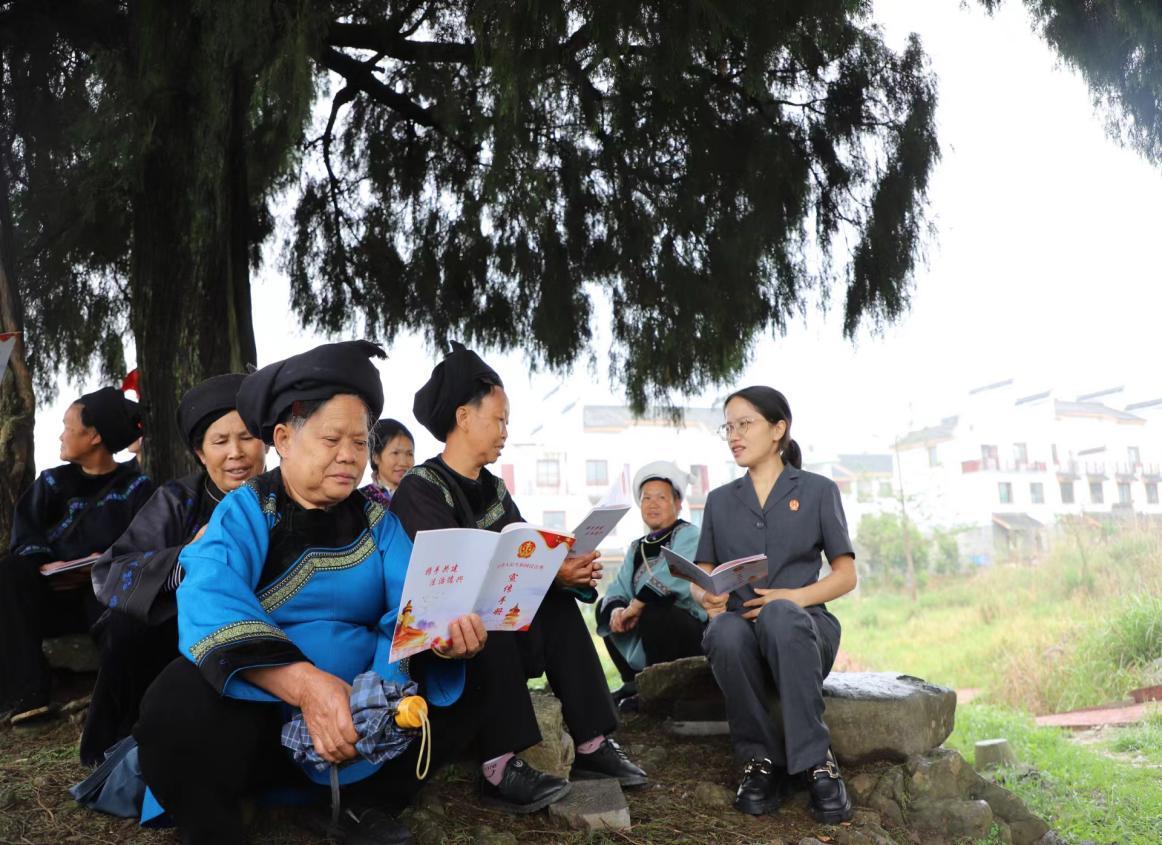 作為一名水族法官,蒙勝翠還結(jié)合本地水族群眾講傳統(tǒng)、重習(xí)俗,蒙勝翠就借助“水書先生”“繡娘”的智慧與經(jīng)驗(yàn),將水家文化習(xí)俗與現(xiàn)代法治精神相融合,通過開展“水語(yǔ)法庭”“布依語(yǔ)法庭”巡回審判,聯(lián)合“水書先生”等鄉(xiāng)賢參與矛盾糾紛調(diào)處,成立“繡娘調(diào)解室”、組建“水鄉(xiāng)巾幗調(diào)解隊(duì)伍”等,開展多方聯(lián)動(dòng),實(shí)現(xiàn)情理法融合,促進(jìn)矛盾糾紛實(shí)質(zhì)化解。