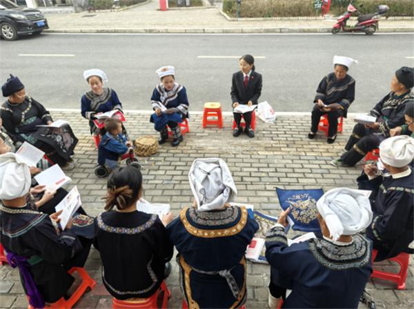 “重婚有違民法典,包辦買賣不對(duì)路,朝三暮四不可取,養(yǎng)老育兒是義務(wù)?!崩C娘們創(chuàng)作的普法水歌生動(dòng)有趣。在雪花湖社區(qū)“繡娘之家”,繡娘們坐在板凳上一邊刺繡一邊興致勃勃地唱著。韋應(yīng)麗介紹說:“在水鄉(xiāng),群眾愛唱歌但識(shí)字不多,學(xué)習(xí)法律有困難。所以我們的繡娘不僅要成為矛盾糾紛調(diào)解的行家,更要成為合格的普法員?!崩C娘們將國家法律法規(guī)和政策編排成“調(diào)解歌”“新時(shí)代女性歌”“孝老愛親歌”“禁毒防邪歌”等少數(shù)民族山歌,唱給群眾聽,讓大家一聽就懂,多聽還能跟著哼唱,對(duì)法律知識(shí)更感興趣,真正做到聽得懂、記得住、用得上。