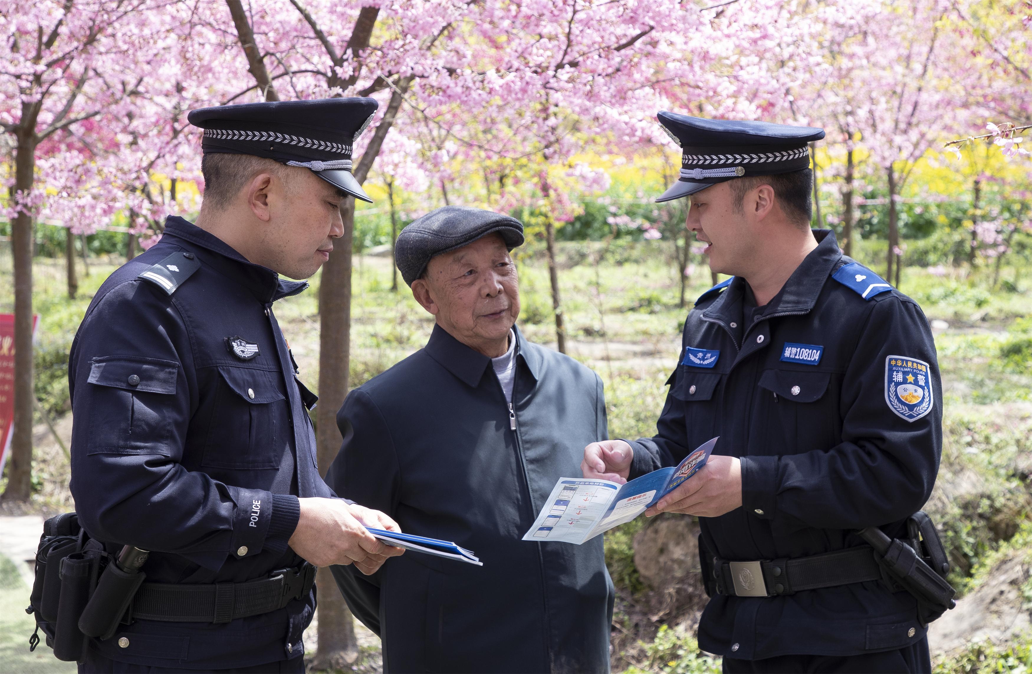 櫻花樹下,民警積極主動,發(fā)放資料、講解案例、解答疑問,與前來賞花的游客“嘮安全、講反詐、話平安”,讓大家在賞花游玩的同時增強(qiáng)了自身安全防范意識。