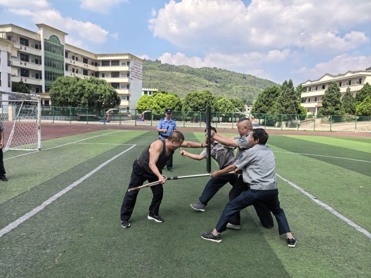 在實(shí)際操作環(huán)節(jié),民輔警們現(xiàn)場演示了盾牌、鋼叉、警棍等警用器械的正確使用方法,從握姿、站位到攻防技巧,每一個(gè)細(xì)節(jié)都講解得細(xì)致入微。隨后,民輔警們組織校園安保人員、教職工分組模擬各種突發(fā)場景開展實(shí)戰(zhàn)演練。各小組迅速反應(yīng),緊密配合,在持盾牌防御、持鋼叉控制、及時(shí)報(bào)警并疏散師生等方面,充分展現(xiàn)出“最小作戰(zhàn)單元”的高效協(xié)同能力。