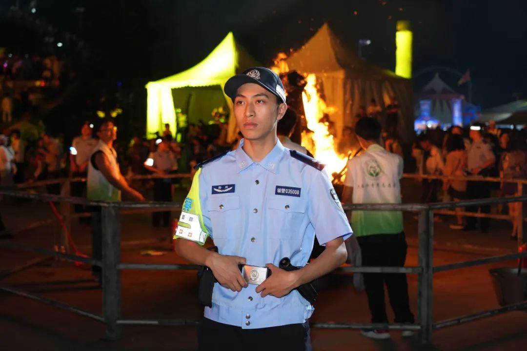 晚上10時(shí),九堆環(huán)形篝火被同時(shí)點(diǎn)燃,數(shù)千支火把剎那間將夜空映照得通紅熾烈。人潮隨著彝族達(dá)體舞的奔放節(jié)奏熱情涌動(dòng)、跳躍。此刻,彝族民警王偉旭正帶領(lǐng)巡邏小組在人流中穿梭,目光銳利如鷹,不放過任何一個(gè)安全死角?!绑艋鹞鑴?dòng)時(shí),必須保證游客處于火星噴射半徑之外,我們民警組成的這道‘隔離帶’,就是守護(hù)生命的安全線!”篝火管控組組長崔恒的話語擲地有聲。