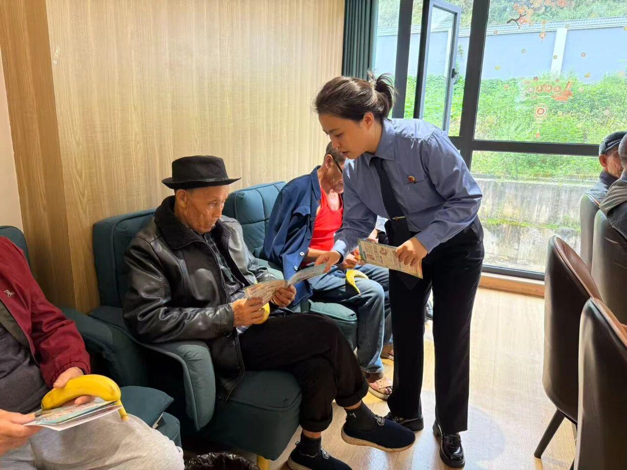 圖為干警為老人發(fā)放法治宣傳資料。