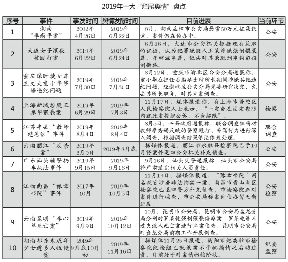 編者按:今年的網(wǎng)絡(luò)輿論場(chǎng)并不平靜,多起涉政法事件引爆輿論場(chǎng),并發(fā)酵成為全網(wǎng)關(guān)注的熱點(diǎn)輿情,引發(fā)輿論震動(dòng)。如備受輿論矚目的孫小果案、鄧世平案,從曝光之日起,就牽動(dòng)著無(wú)數(shù)輿論目光。近日,相關(guān)涉案人員陸續(xù)受審獲刑,背后的“保護(hù)傘”也被立案調(diào)查。這類(lèi)重大輿情事件不“爛尾”,體現(xiàn)出各級(jí)政法機(jī)關(guān)依法履行職責(zé)的自覺(jué)和擔(dān)當(dāng),值得稱(chēng)道。然而也需看到,2019年接近尾聲,仍有不少輿情事件沒(méi)有掃尾,輿論場(chǎng)還遺留大量問(wèn)號(hào)等待拉直。近年來(lái),政法網(wǎng)絡(luò)輿情回應(yīng)率穩(wěn)步提升的前提下,輿情事件的處置完結(jié)率卻忽高忽低,2019年上半年不到六成事件有最終結(jié)果,遠(yuǎn)低于2018年全年75%的比率。鑒于此,法制網(wǎng)輿情中心(ID:fzwyqzx)盤(pán)點(diǎn)這一年的重大政法輿情事件,梳理出那些長(zhǎng)時(shí)間沒(méi)有進(jìn)展和結(jié)果的“爛尾輿情”,并通過(guò)分析其類(lèi)型、總結(jié)其特征、剖析其危害,提出規(guī)避與應(yīng)對(duì)的建議,以供有關(guān)部門(mén)參考借鑒。